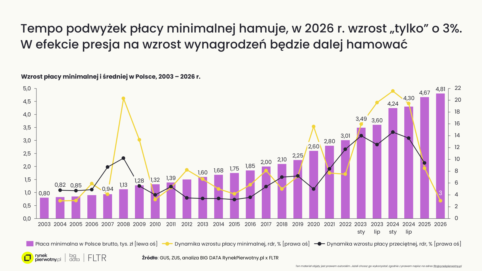 Minimalne wynagrodzenie brutto w 2026 r. będzie wynosiło 4806 zł brutto, co oznacza raptem 3% wzrost w porównaniu z rokiem poprzednim - to najniższa podwyżka od 20 lat! Przez ostatnie 5 lat dynamika podwyżek była znacznie wyższa (sięgając nawet 20%) - to z kolei wpływało na wzrost płacy przeciętnej i pozwalało zwiększać siłę nabywczą klientów, choć z drugiej strony było też mocnym driverem kosztów wykonawstwa. Teraz sytuacja zdaje się odwrócić, a podwyżka płacy minimalnej będzie ściągała w dół wzrost siły nabywczej, kosztów - ale też potencjalnie inflacji usług.