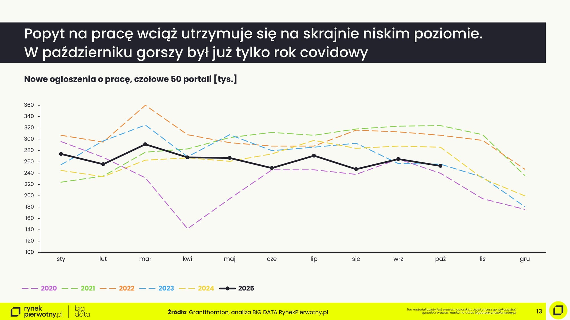 W październiku 2025 r. na portalach ogłoszeniowych pojawiło się w sumie 253 tys. nowych ogłoszeń - to wynik rekordowo niski i tylko nieznacznie wyższy od tego w trakcie pandemicznego 2020 roku. Rok do roku liczba ofert spała o -12%, a znacznie gorsze wyniki w rekrutacjach notują głównie Katowice i Bydgoszcz. To potwierdzałoby naszą tezę z ostatniej analizy "W górę, czy w dół" o jeszcze mocniejszym wyhamowaniu rynku pracy i pogłębieniu gorszych nastrojów wśród konsumentów, co nadal odbija się echem na rynku nieruchomości